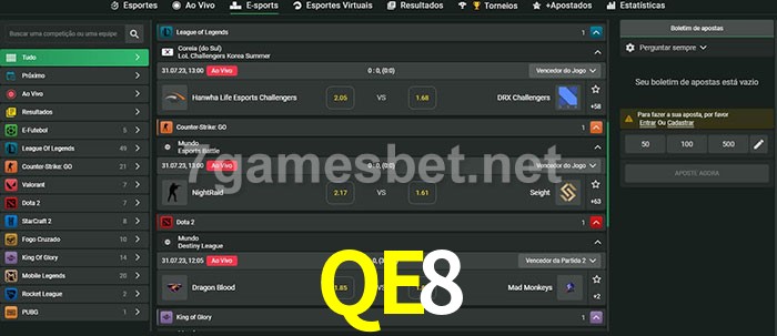 O QE8 oferece uma grande seleção de opções de apostas em e-sports com probabilidades competitivas